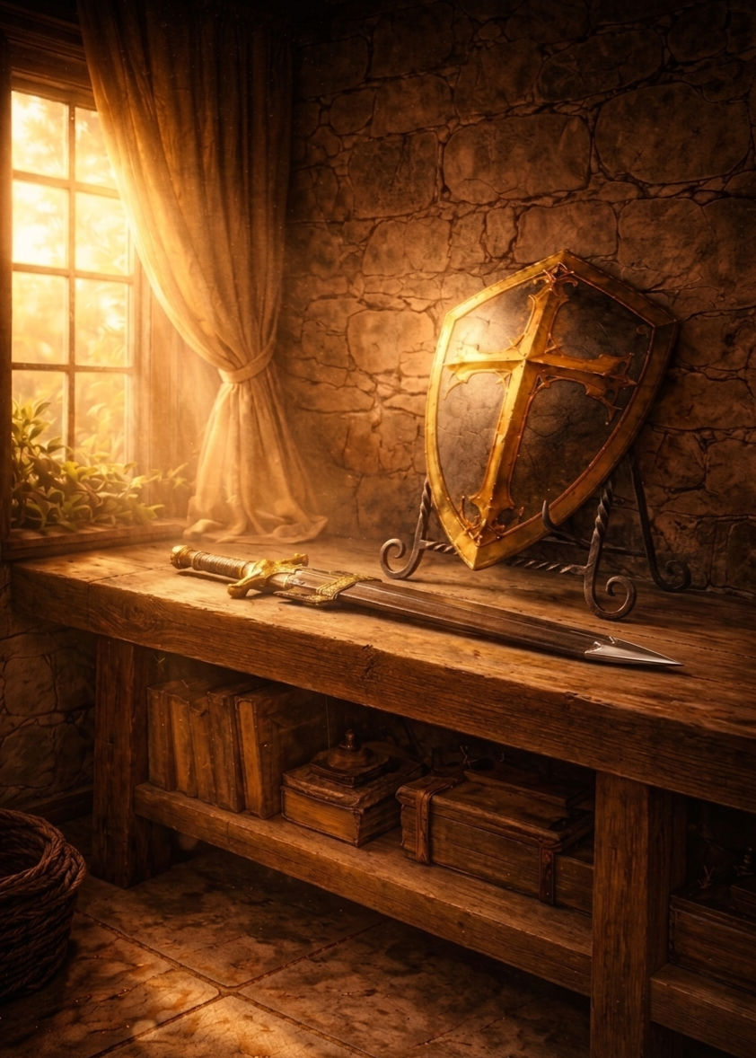 From shards of shell, He forged a knight. Each fragment of shell—once scattered—was set into him, not as memory, but as strength. Armor that caught and carried the dawn, burning gold like flame in the first light. A sword, honed in unyielding truth, was placed in his hand, and upon his arm rested the Shield of Faith, unbroken beneath the press of darkness.